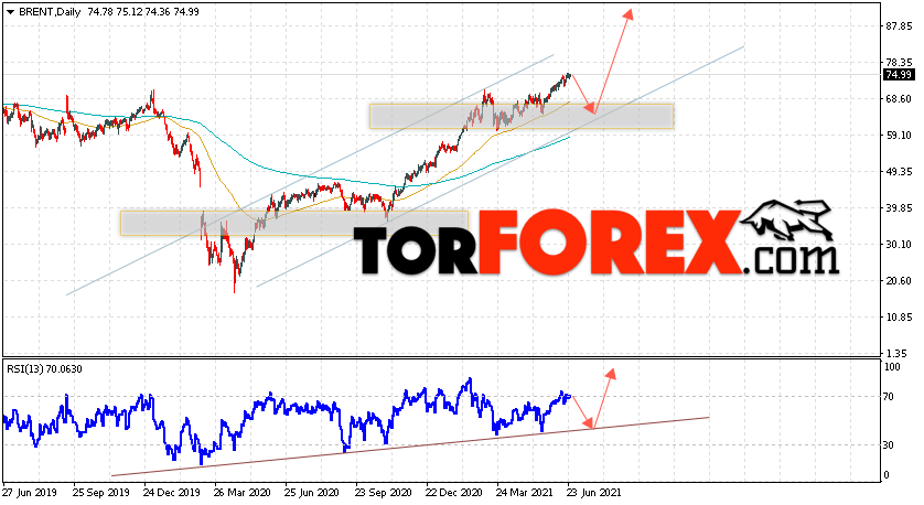 Дополнительным сигналом в пользу подъёма котировок нефти на текущей неделе выступит тест линии поддержки на индикаторе относительной силы. Вторым сигналом станет отскок от нижней границы восходящего канала. Отменой варианта роста котировок и цен на нефть BRENT на торговой неделе 28 июня — 2 июля 2021 станет падение и пробой уровня 57.05. Это укажет на пробой области поддержки и продолжение падения нефти в область ниже уровня 53.55. С пробоем области сопротивления и закрытием котировок выше уровня 78.65 стоит ожидать подтверждения роста цены на нефть BRENT.