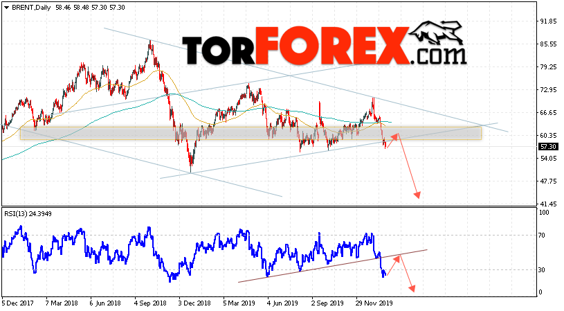 Дополнительным сигналом в пользу снижения котировок нефти на текущей неделе выступит тест линии сопротивления на индикаторе относительной силы. Вторым сигналом станет отскок от нижней границы восходящего канала. Отменой варианта падения котировок и цен на нефть BRENT на торговой неделе 3 — 7 февраля 2020 станет сильный рост и пробой уровня 67.05. Это укажет на пробой верхней границы нисходящего канала и продолжение роста нефти в область выше уровня 72.05. С пробоем области поддержки и и закрытием котировок ниже уровня 52.05 стоит ожидать подтверждения снижения цены на нефть BRENT.