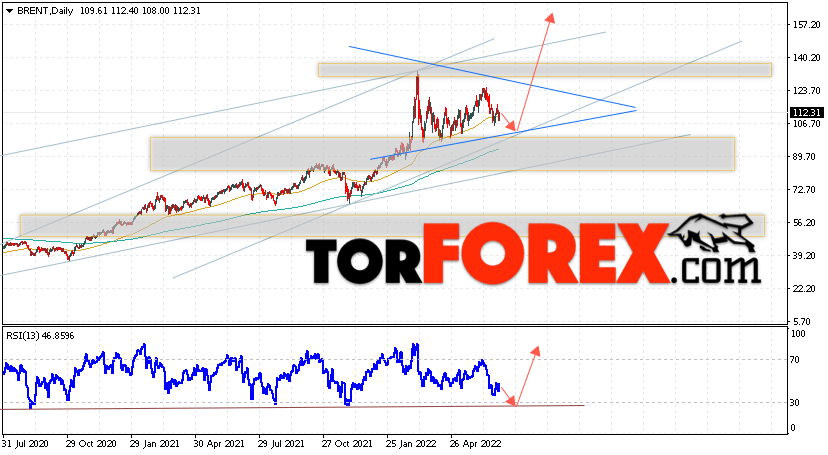 Дополнительным сигналом в пользу роста котировок нефти на текущей неделе выступит тест линии поддержки на индикаторе относительной силы. Вторым сигналом станет отскок от нижней границы бычьего канала. Отменой варианта роста котировок и цен на нефть BRENT на торговой неделе 4 — 8 июля 2022 станет падение и пробой уровня 90.05. Это укажет на пробой области поддержки и продолжение падения нефти в область ниже уровня 80.05. С пробоем области сопротивления и закрытием котировок выше уровня 126.55 стоит ожидать подтверждения подъёма цены на нефть BRENT, что укажет на пробой верхней границы модели ”Треугольник” и начало отработки этого паттерна.