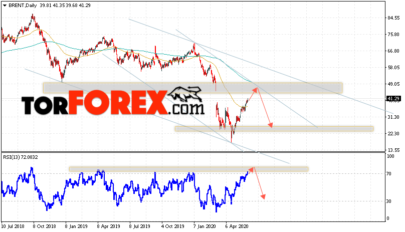 Дополнительным сигналом в пользу падения котировок нефти на текущей неделе выступит тест линии сопротивления на индикаторе относительной силы. Вторым сигналом станет отскок от верхней границы нисходящего канала. Отменой варианта падения котировок и цен на нефть BRENT на торговой неделе 8 — 12 июня 2020 станет сильный рост и пробой уровня 50.55. Это укажет на пробой области сопротивления и продолжение роста нефти в область выше уровня 60.05. С пробоем области поддержки и закрытием котировок ниже уровня 35.65 стоит ожидать подтверждения падения цены на нефть BRENT.