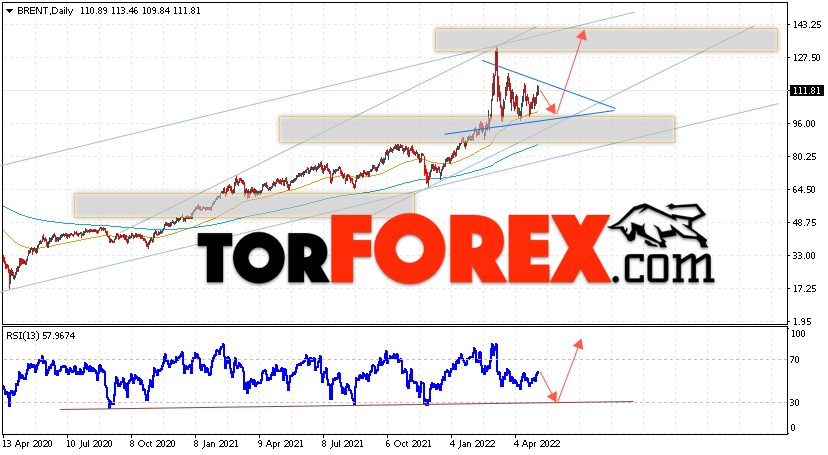 Дополнительным сигналом в пользу роста котировок нефти на текущей неделе выступит тест линии поддержки на индикаторе относительной силы. Вторым сигналом станет отскок от нижней границы бычьего канала. Отменой варианта роста котировок и цен на нефть BRENT на торговой неделе 9 — 13 мая 2022 станет падение и пробой уровня 94.05. Это укажет на пробой области поддержки и продолжение падения нефти в область ниже уровня 85.05. С пробоем области сопротивления и закрытием котировок выше уровня 120.05 стоит ожидать подтверждения подъёма цены на нефть BRENT и начала отработки модели ”Треугольник”.