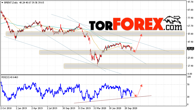 Дополнительным сигналом в пользу подъёма котировок нефти на текущей неделе выступит тест линии поддержки на индикаторе относительной силы. Вторым сигналом станет отскок от верхней границы нисходящего канала. Отменой варианта роста котировок и цен на нефть BRENT на торговой неделю 9 — 13 ноября 2020 станет падение и пробой уровня 32.05. Это укажет на пробой области поддержки и продолжение падения нефти в область ниже уровня 25.05. С пробоем области сопротивления и закрытием котировок выше уровня 48.05 стоит ожидать подтверждения роста цены на нефть BRENT.