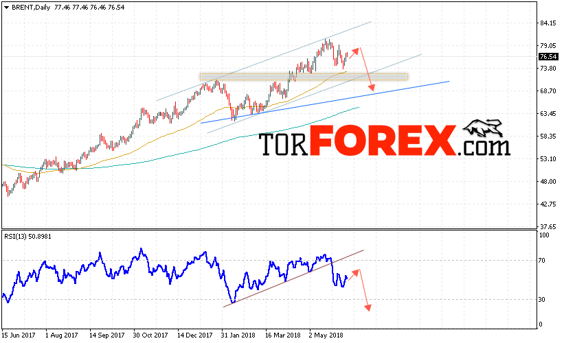 Таким образом, Прогноз цен на нефть BRENT на 11 — 15 июня 2018 предполагает попытку теста сопротивления вблизи уровня 77.00, откуда стоит ожидать отскок и попытку продолжения падения нефти с потенциальной целью на уровне 68.00, дополнительным сигналом в пользу падения цены нефти выступит тест области сопротивления на индикаторе относительной силы, отменой варианта падения станет сильный рост и пробой области 81.00.