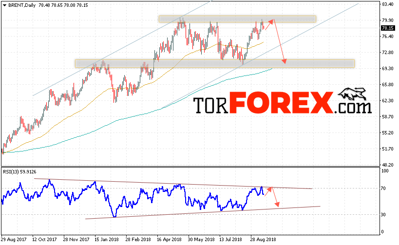 Котировки нефти марки BRENT завершают торговую неделю вблизи области 78.15 долларов за баррель и продолжает движение в рамках формирования разворотной модели «Двойная Вершина». В рамках публикации прогноза Прогноз цен на нефть BRENT на 17 — 21 сентября 2018 стоит ожидать попытку теста области сопротивления вблизи уровня 79.90 и начала падения нефти в область ниже уровня 71.50 доллара за баррель.