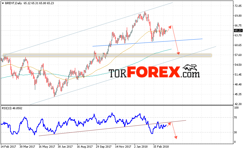 Таким образом, Прогноз цен на нефть BRENT на 19 — 23 марта 2018 предполагает попытку теста сопротивления вблизи уровня 66.50, откуда стоит ожидать отскок и попытку продолжения падения нефти с потенциальной целью на уровне 57.50, дополнительным сигналом в пользу падения цены нефти выступит тест линии тренда на индикаторе относительной силы, отменой варианта падения станет сильный рост и пробой области поддержки 72.00.