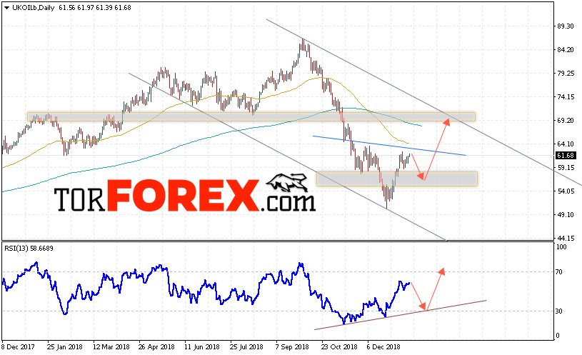 Таким образом, Прогноз цен на нефть BRENT на 21 — 25 января 2019 предполагает попытку теста области поддержки вблизи уровня 57.50. Откуда стоит ожидать отскок и попытку роста нефти с потенциальной целью на уровне 69.20. Дополнительным сигналом в пользу подъёма цены нефти выступит тест линии тренда на индикаторе относительной силы. Отменой варианта роста станет падение и пробой области 52.50. Это укажет на пробой уровня поддержки и продолжение снижения цены нефти.