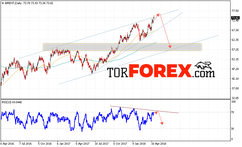 Таким образом, Прогноз цен на нефть BRENT на 23 — 27 апреля 2018 предполагает попытку теста сопротивления вблизи уровня 74.50, откуда стоит ожидать отскок и попытку продолжения падения нефти с потенциальной целью на уровне 60.00, дополнительным сигналом в пользу падения цены нефти выступит тест линии тренда на индикаторе относительной силы, отменой варианта падения станет сильный рост и пробой области 75.50.