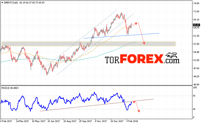 Таким образом, Прогноз цен на нефть BRENT на 26 февраля — 2 марта 2018 предполагает попытку теста сопротивления вблизи уровня 66.50, откуда стоит ожидать отскок и попытку продолжения падения нефти с потенциальной целью на уровне 57.50, дополнительным сигналом в пользу падения цены нефти выступит тест линии тренда на индикаторе относительной силы, отменой варианта падения станет сильный рост и пробой области поддержки 70.00.