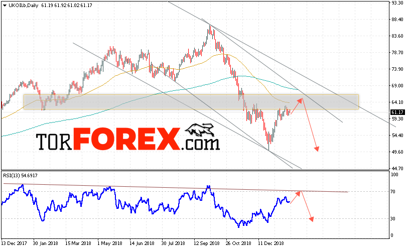 Дополнительным сигналом в пользу снижения котировок нефти на текущей неделе выступит тест линии тренда на индикаторе относительной силы. А также отскок от верхней границы нисходящего канала. Отменой варианта падения котировок и цен на нефть BRENT на торговой неделе 28 января — 1 февраля 2019 станет сильный рост и пробой уровня 67.50. Это укажет на пробой верхней границы канала и продолжение роста нефти в область выше уровня 75.00. С пробоем области поддержки и закрытием котировок ниже уровня 58.50 стоит ожидать подтверждения снижения цены на нефть BRENT.