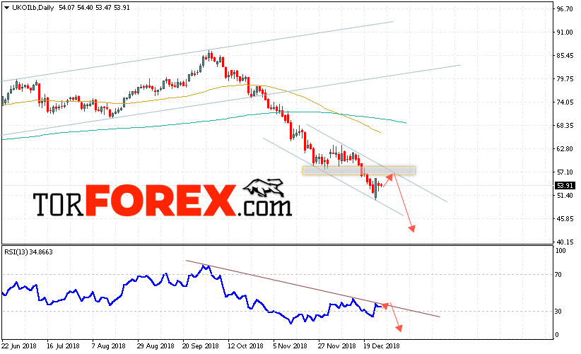 Дополнительным сигналом в пользу падения котировок нефти на текущей неделе выступит тест линии тренда на индикаторе относительной силы. А также отскок от верхней границы нисходящего канала. Отменой варианта падения котировок и цен на нефть BRENT на торговой неделе 31 декабря — 4 января 2019 станет сильный рост и пробой уровня 58.70. Это укажет на пробой верхней границы канала и продолжение роста нефти в область выше уровня 65.50. С пробоем области поддержки и закрытием ниже уровня 51.50 стоит ожидать подтверждения падения цены на нефть BRENT.