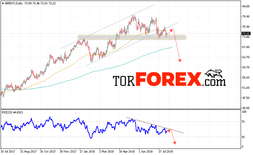 Таким образом, Прогноз цен на нефть BRENT на 6 — 10 августа 2018 предполагает попытку теста сопротивления вблизи уровня 75.50, откуда стоит ожидать отскок и попытку падения нефти с потенциальной целью на уровне 63.50, дополнительным сигналом в пользу падения цены нефти выступит тест линии тренда на индикаторе относительной силы, отменой варианта падения станет сильный рост и пробой области 79.50, что укажет на пробой области сопротивления и продолжение роста.