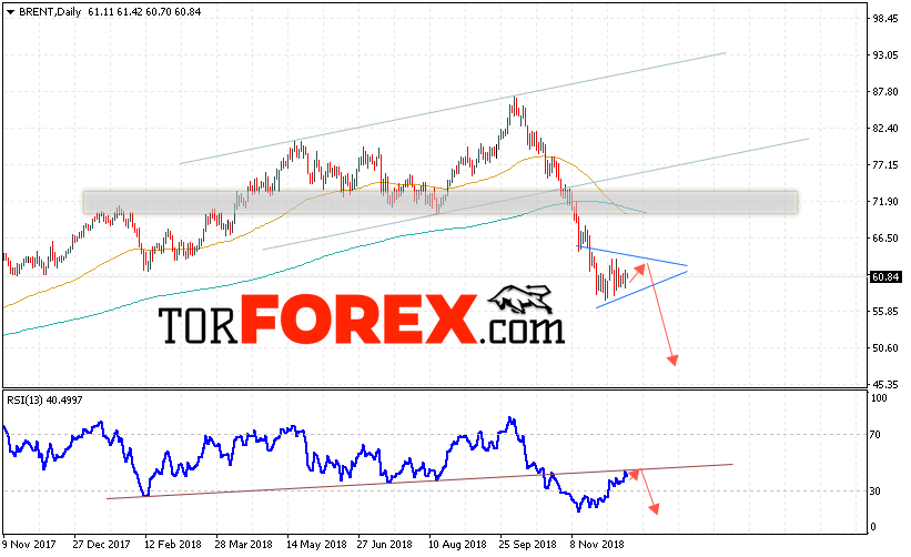Таким образом, Прогноз цен на нефть BRENT на неделю 17 — 21 декабря 2018 предполагает попытку теста области сопротивления вблизи уровня 63.50. Откуда стоит ожидать отскок и попытку падения нефти с потенциальной целью на уровне 48.50. Дополнительным сигналом в пользу снижения цены нефти выступит тест линии тренда на индикаторе относительной силы. Отменой варианта падения станет сильный рост и пробой области 66.50. Это укажет на пробой области сопротивления и продолжение роста цены нефти.
