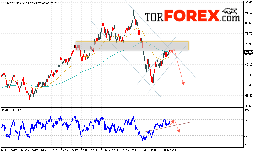 Дополнительным сигналом в пользу снижения котировок нефти на текущей неделе выступит формирование разворотной модели «Голова и плечи» на индикаторе относительной силы. Вторым сигналом станет отскок от верхней границы нисходящего канала. Отменой варианта падения котировок и цен на нефть BRENT на торговой неделе 18 — 22 марта 2019 станет сильный рост и пробой уровня 71.50. Это укажет на пробой верхней границы канала и продолжение роста нефти в область выше уровня 75.00. С пробоем нижней границы восходящего канала и закрытием котировок ниже уровня 62.50 стоит ожидать подтверждения снижения цены на нефть BRENT.