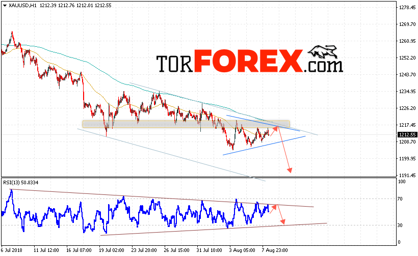 Таким образом, XAU/USD прогноз цен на Золото на 9 августа 2018 предполагает попытку теста области сопротивления вблизи уровня 1217 и продолжения падения котировок с целью ниже уровня 1190, отменой варианта падения цен на Золото выступит пробой уровня 1225, что укажет на выход котировок за пределы нисходящего канала, в этом случае стоит ожидать продолжения роста в область выше уровня 1255.