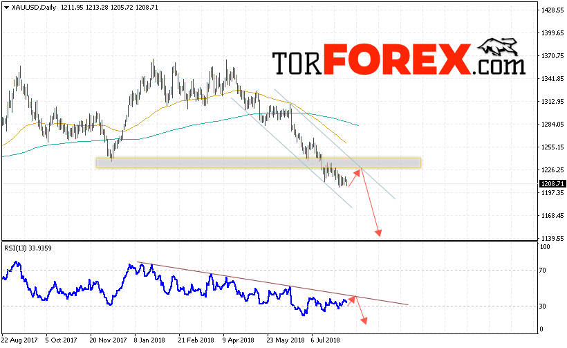 Таким образом, XAU/USD прогноз цен Золота на 13 — 17 августа 2018 предполагает попытку теста уровня сопротивления вблизи области 1225 и продолжения падения цен на Золото с целью ниже уровня 1140, в пользу падения выступит тест линии тренда на индикаторе относительной силы, отменой варианта падения Золота станет пробой уровня 1245, что укажет на выход котировок за пределы канала и продолжение роста в область выше уровня 1285.