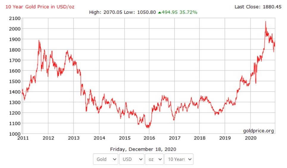 За последнее десятилетие стоимость золота разнилась – исторические данные представлены ниже на графике.
