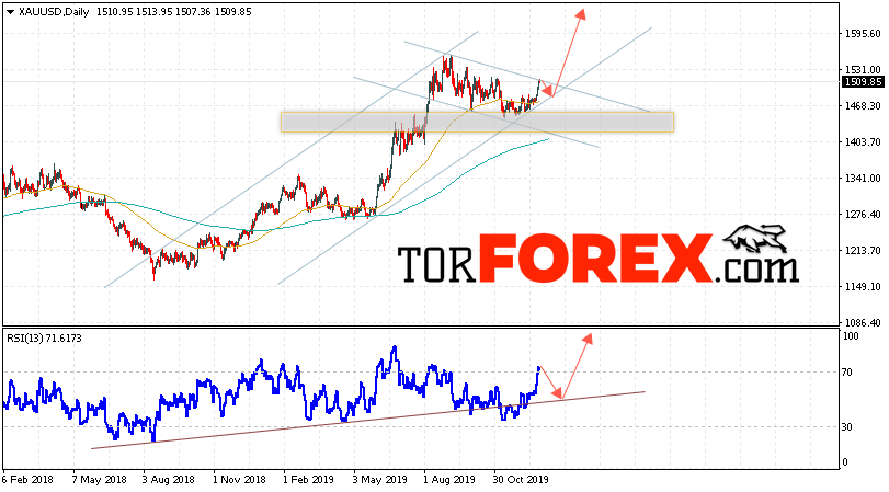 Дополнительным сигналом в пользу роста котировок и цен на Золото на текущей торговой неделе 30 декабря 2019 — 3 января 2020 выступит тест восходящей линии тренда на индикаторе относительной силы. Вторым сигналом станет отскок от нижней границы восходящего канала. Отменой варианта роста котировок XAU/USD выступит падение и пробой области 1410. Это укажет на пробой уровня поддержки и продолжение падения цен на Золото с целью ниже уровня 1335. Подтверждением роста стоимости актива выступит пробой верхней границы нисходящего канала и закрытие котировок выше уровня 1525.