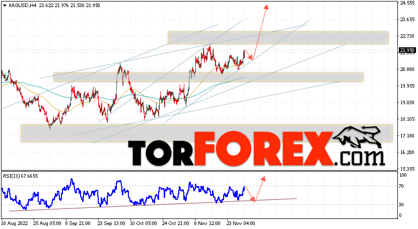 Дополнительным сигналом в пользу подъёма котировок и цен на Серебро XAG/USD выступит тест линии поддержки на индикаторе относительной силы (RSI). Вторым сигналом в пользу роста станет отскок от нижней границы бычьего канала. Отменой варианта подъёма цен на Серебро 1 декабря 2022 станет падение и пробой 20.05. Это укажет на пробой области поддержки и продолжение падения в область ниже уровня 17.85. Ожидать ускорения роста котировок XAG/USD стоит с пробоем области сопротивления и закрытием цены над уровнем 23.05, что укажет на пробой верхней границы бычьего канала, а это сигнал к росту на ширину канала.