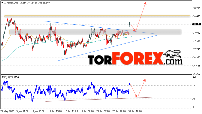 Дополнительным сигналом в пользу подъёма котировок и цен на Серебро XAG/USD выступит тест линии поддержки на индикаторе относительной силы. Вторым сигналом в пользу роста станет отскок от верхней границы модели «Треугольник». Отменой варианта роста цен на Серебро 1 июля 2020 станет падение и пробой 17.20. Это укажет на пробой области поддержки и продолжение падения в область ниже уровня 16.05. Ожидать ускорения роста котировок XAG/USD стоит с пробоем области сопротивления и закрытием цен над уровнем 18.55.