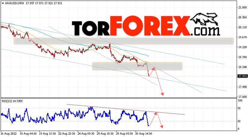 Дополнительным сигналом в пользу падения котировок и цен на Серебро XAG/USD выступит тест линии сопротивления на индикаторе относительной силы (RSI). Вторым сигналом в пользу падения станет отскок от верхней границы нисходящего канала. Отменой варианта падения цен на Серебро 1 сентября 2022 станет сильный рост и пробой 18.75. Это укажет на пробой области сопротивления и продолжение роста в область выше уровня 21.65. Ожидать ускорения падения котировок XAG/USD стоит с пробоем области поддержки и закрытием цены под уровнем 17.65, что укажет на пробой нижней границы нисходящего канала.