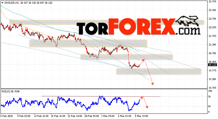 Дополнительным сигналом в пользу снижения котировок и цен на Серебро XAG/USD выступит тест линии сопротивления на индикаторе относительной силы (RSI). Вторым сигналом в пользу снижения станет отскок от верхней границы нисходящего канала. Отменой варианта падения цен на Серебро 10 марта 2023 станет сильный рост и пробой 21.05. Это укажет на пробой области сопротивления и продолжение роста в область выше уровня 22.65. Ожидать ускорения падения котировок XAG/USD стоит с пробоем области поддержки и закрытием цены под уровнем 19.05, что укажет на пробой нижней границы нисходящего канала, а это сигнал к падению на ширину канала.