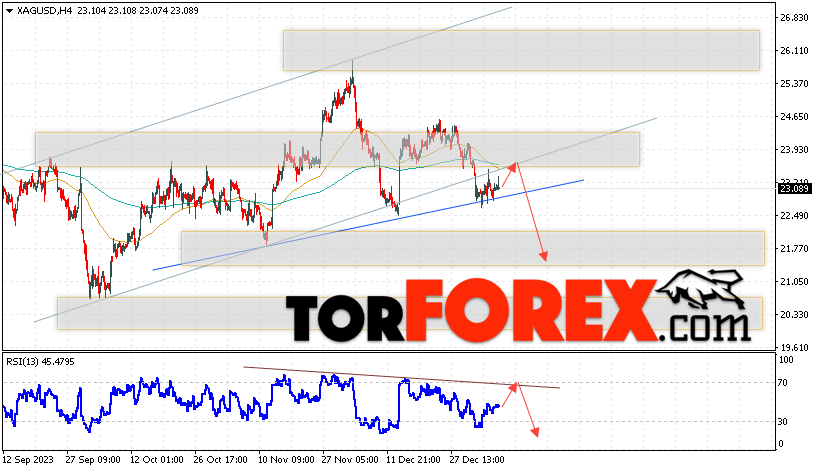 Дополнительным сигналом в пользу падения котировок и цен на Серебро XAG/USD выступит тест линии сопротивления на индикаторе относительной силы (RSI). Вторым сигналом в пользу снижения станет отскок от нижней границы бычьего канала. Отменой варианта падения цен на Серебро 10 января 2024 станет сильный рост и пробой 24.85. Это укажет на пробой области сопротивления и продолжение роста в область выше уровня 26.75. Ожидать ускорения падения котировок XAG/USD стоит с пробоем области поддержки и закрытием цены под уровнем 22.25, что укажет на пробой нижней границы разворотной модели «Голова и плечи» и начало отработки паттерна с целями внизу.