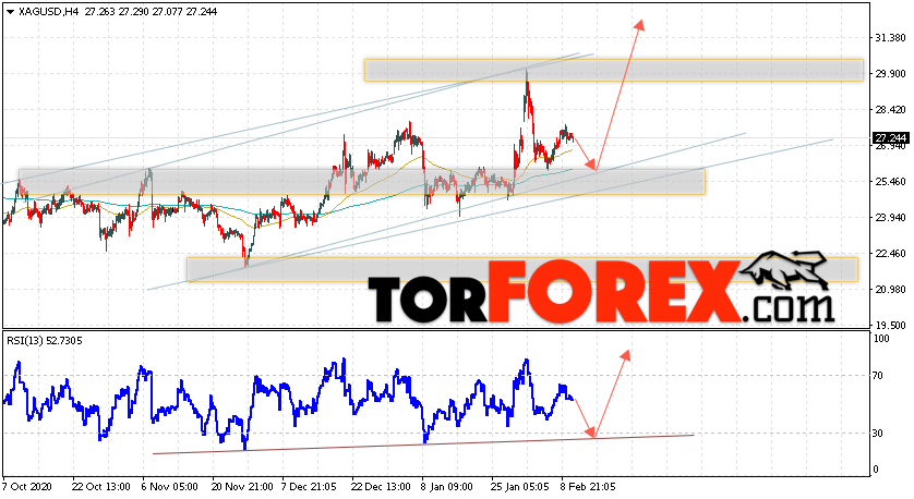 Дополнительным сигналом в пользу подъёма котировок и цен на Серебро XAG/USD выступит тест линии поддержки на индикаторе относительной силы. Вторым сигналом в пользу роста станет отскок от нижней границы восходящего канала. Отменой варианта роста цен на Серебро 11 февраля 2021 станет падение и пробой 23.95. Это укажет на пробой области поддержки и продолжение падения в область ниже уровня 22.35. Ожидать ускорения подъёма котировок XAG/USD стоит с пробоем области сопротивления и закрытием цены над уровнем 29.95.