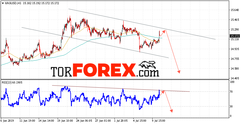 В пользу падения котировок XAG/USD выступит тест линии сопротивления на индикаторе относительной силы. Вторым сигналом станет отскок от верхней границы нисходящего канала. Отменой варианта падения цен на Серебро 11 июля 2019 станет сильный рост и пробой 15.45. Это укажет на пробой области сопротивления и продолжение роста в область выше уровня 15.95. Ожидать ускорения снижения котировок XAG/USD стоит с пробоем области поддержки и закрытием под уровнем 14.95.