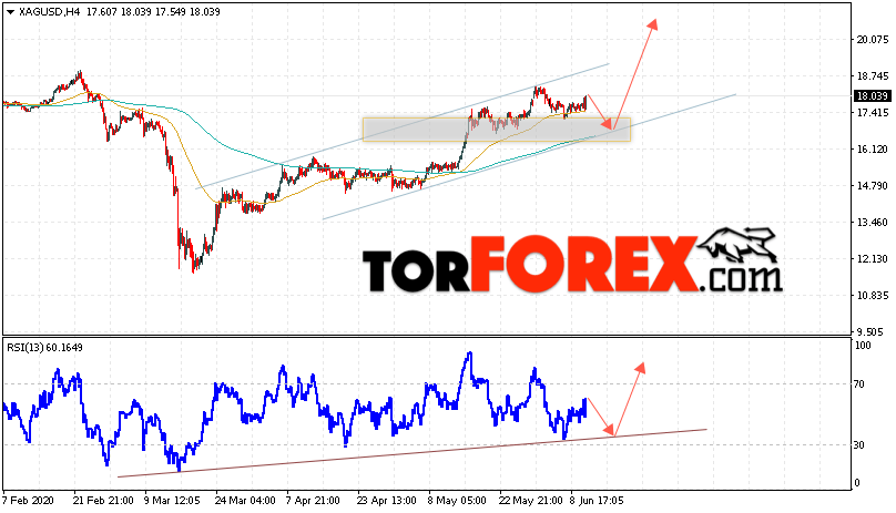 Дополнительным сигналом в пользу роста котировок и цен на Серебро XAG/USD выступит тест линии поддержки на индикаторе относительной силы. Вторым сигналом в пользу роста станет отскок от нижней границы восходящего канала. Отменой варианта подъёма цен на Серебро 11 июня 2020 станет падение и пробой 16.05. Это укажет на пробой области поддержки и продолжение падения в область ниже уровня 14.05. Ожидать ускорения роста котировок XAG/USD стоит с пробоем области сопротивления и закрытием цен над уровнем 18.65.
