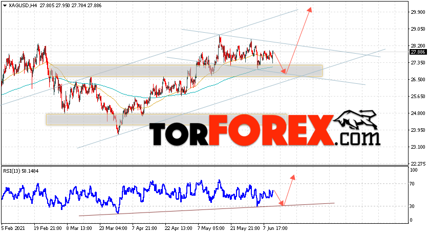 Дополнительным сигналом в пользу подъёма котировок и цен на Серебро XAG/USD выступит тест линии поддержки на индикаторе относительной силы. Вторым сигналом в пользу роста станет отскок от нижней границы бычьего канала. Отменой варианта роста цен на Серебро 11 июня 2021 станет падение и пробой 25.65. Это укажет на пробой области поддержки и продолжение падения в область ниже уровня 22.35. Ожидать ускорения подъёма котировок XAG/USD стоит с пробоем области сопротивления и закрытием цены над уровнем 28.55.