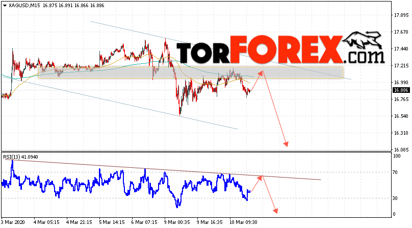 Дополнительным сигналом в пользу падения котировок и цен на Серебро XAG/USD выступит тест линии сопротивления на индикаторе относительной силы. Вторым сигналом в пользу снижения станет отскок от верхней границы нисходящего канала. Отменой варианта падения цен на Серебро 11 марта 2020 станет сильный рост и пробой 17.55. Это укажет на пробой области сопротивления и продолжение роста в область выше уровня 18.45. Ожидать ускорения падения котировок XAG/USD стоит с пробоем области поддержки и закрытием под уровнем 16.45.