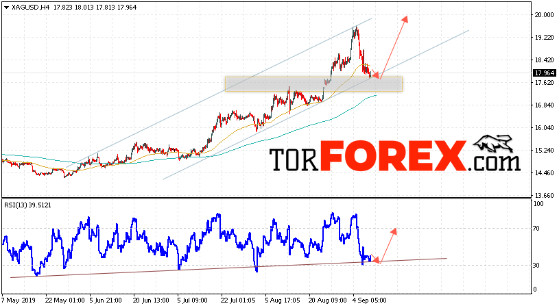 В пользу роста котировок XAG/USD выступит тест восходящей линии поддержки на индикаторе относительной силы. Вторым сигналом станет отскок от нижней границы бычьего канала. Отменой варианта роста цен на Серебро 11 сентября 2019 станет падение и пробой 17.40. Это укажет на пробой нижней границы восходящего канала и продолжение падения в область ниже уровня 16.75. Ожидать ускорения роста котировок XAG/USD стоит с пробоем области сопротивления и закрытием над уровнем 18.55.