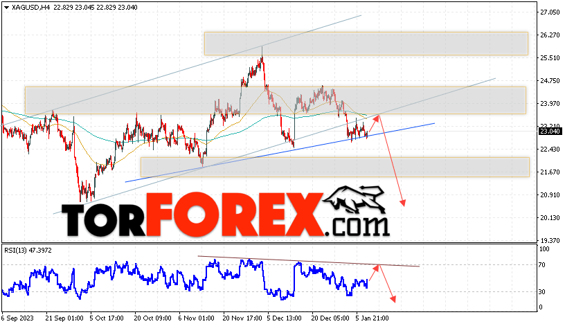Дополнительным сигналом в пользу падения котировок и цен на Серебро XAG/USD выступит тест линии сопротивления на индикаторе относительной силы (RSI). Вторым сигналом в пользу снижения станет отскок от нижней границы бычьего канала. Отменой варианта падения цен на Серебро 11 января 2024 станет сильный рост и пробой 24.85. Это укажет на пробой области сопротивления и продолжение роста в область выше уровня 26.75. Ожидать ускорения падения котировок XAG/USD стоит с пробоем области поддержки и закрытием цены под уровнем 22.25, что укажет на пробой нижней границы разворотной модели «Голова и плечи» и начало отработки паттерна с целями внизу.