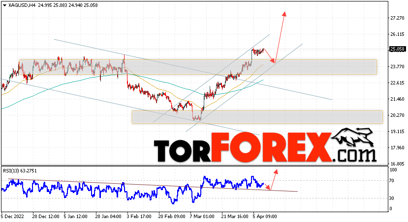Дополнительным сигналом в пользу подъёма котировок и цен на Серебро XAG/USD выступит тест линии поддержки на индикаторе относительной силы (RSI). Вторым сигналом в пользу роста станет отскок от верхней границы разворотной модели. Отменой варианта подъёма цен на Серебро 12 апреля 2023 станет падение и пробой 23.45. Это укажет на пробой области сопротивления и продолжение роста в область выше уровня 19.75. Ожидать ускорения роста котировок XAG/USD стоит с пробоем области сопротивления и закрытием цены над уровнем 26.25, что укажет на пробой верхней границы бычьего канала, а это сигнал к росту на ширину канала.