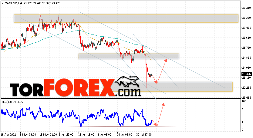 Дополнительным сигналом в пользу роста котировок и цен на Серебро XAG/USD выступит тест линии тренда на индикаторе относительной силы (RSI). Вторым сигналом в пользу подъёма станет отскок от нижней границы нисходящего канала. Отменой варианта роста цен на Серебро 12 августа 2021 станет падение и пробой 21.45. Это укажет на пробой области поддержки и продолжение падения в область ниже уровня 20.15. Ожидать ускорения подъёма котировок XAG/USD стоит с пробоем области сопротивления и закрытием цены над уровнем 24.35.