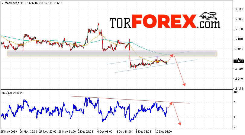 В пользу падения котировок и цен на Серебро XAG/USD выступит тест линии сопротивления на индикаторе относительной силы. Вторым сигналом в пользу снижения станет отскок от верхней границы нисходящего канала. Отменой варианта падения цен на Серебро 12 декабря 2019 станет сильный рост и пробой 17.05. Это укажет на пробой верхней границы нисходящего канала и продолжение роста в область выше уровня 18.05. Ожидать ускорения падения котировок XAG/USD стоит с пробоем области поддержки и закрытием под уровнем 16.45.