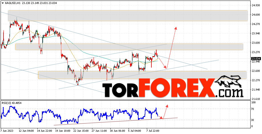 Дополнительным сигналом в пользу подъёма котировок и цен на Серебро XAG/USD выступит тест линии поддержки на индикаторе относительной силы (RSI). Вторым сигналом в пользу роста станет отскок от нижней границы бычьего канала. Отменой варианта роста цен на Серебро 12 июля 2023 станет падение и пробой 22.35. Это укажет на пробой области сопротивления и продолжение снижения в область ниже уровня 21.15. Ожидать ускорения подъёма котировок XAG/USD стоит с пробоем области сопротивления и закрытием цены над уровнем 23.45, что укажет на пробой верхней границы нисходящего канала.