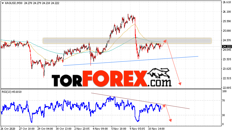 Дополнительным сигналом в пользу снижения котировок и цен на Серебро XAG/USD выступит тест линии сопротивления на индикаторе относительной силы. Вторым сигналом в пользу падения станет отскок от уровня формирования правого ”Плеча” модели ”Голова и плечи”. Отменой варианта падения цен на Серебро 12 ноября 2020 станет сильный рост и пробой 26.15. Это укажет на пробой области сопротивления и продолжение роста в область выше уровня 27.55. Ожидать ускорения падения котировок XAG/USD стоит с пробоем области поддержки и закрытием цен под уровнем 23.05.