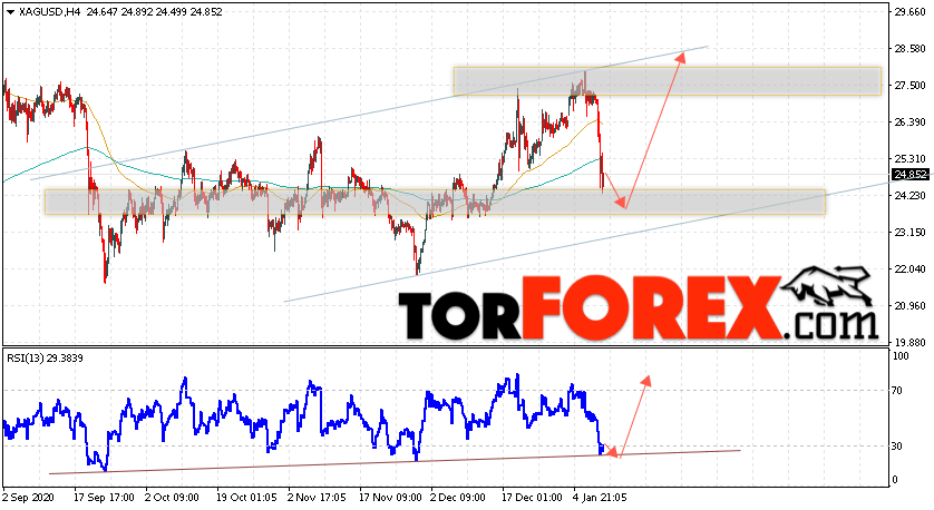 Дополнительным сигналом в пользу подъёма котировок и цен на Серебро XAG/USD выступит тест линии поддержки на индикаторе относительной силы. Вторым сигналом в пользу роста станет отскок от нижней границы восходящего канала. Отменой варианта роста цен на Серебро 12 января 2021 станет падение и пробой 22.15. Это укажет на пробой области поддержки и продолжение падения в область ниже уровня 20.05. Ожидать ускорения подъёма котировок XAG/USD стоит с пробоем области сопротивления и закрытием цены над уровнем 26.45.