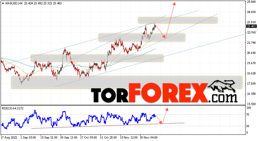 Дополнительным сигналом в пользу подъёма котировок и цен на Серебро XAG/USD выступит тест линии поддержки на индикаторе относительной силы (RSI). Вторым сигналом в пользу роста станет отскок от нижней границы бычьего канала. Отменой варианта подъёма цен на Серебро 13 декабря 2022 станет падение и пробой 21.15. Это укажет на пробой области поддержки и продолжение падения в область ниже уровня 18.95. Ожидать ускорения роста котировок XAG/USD стоит с пробоем области сопротивления и закрытием цены над уровнем 25.05, что укажет на пробой верхней границы бычьего канала.