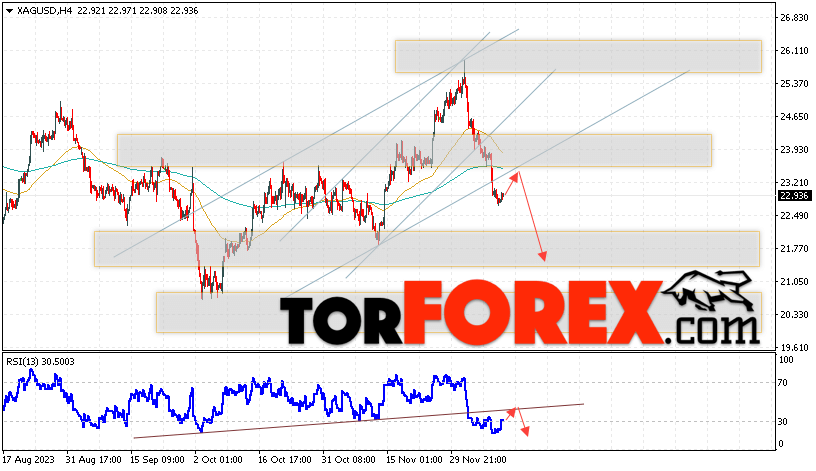 Дополнительным сигналом в пользу падения котировок и цен на Серебро XAG/USD выступит тест линии сопротивления на индикаторе относительной силы (RSI). Вторым сигналом в пользу снижения станет отскок от нижней границы бычьего канала. Отменой варианта падения цен на Серебро 13 декабря 2023 станет сильный рост и пробой 24.55. Это укажет на пробой области сопротивления и продолжение роста в область выше уровня 25.25. Ожидать ускорения падения котировок XAG/USD стоит с пробоем области поддержки и закрытием цены под уровнем 22.35.