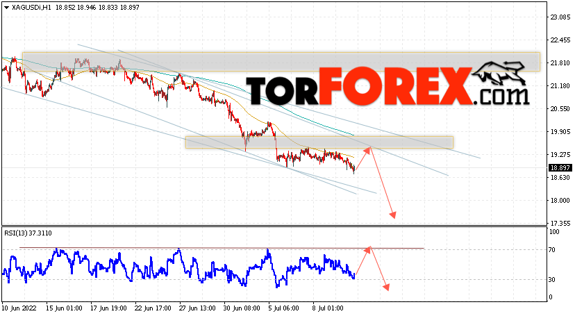 Дополнительным сигналом в пользу падения котировок и цен на Серебро XAG/USD выступит тест линии сопротивления на индикаторе относительной силы (RSI). Вторым сигналом в пользу падения станет отскок от верхней границы медвежьего канала. Отменой варианта падения цен на Серебро 13 июля 2022 станет сильный рост и пробой 20.45. Это укажет на пробой области сопротивления и продолжение роста в область выше уровня 22.05. Ожидать ускорения падения котировок XAG/USD стоит с пробоем области поддержки и закрытием цены под уровнем 18.45.