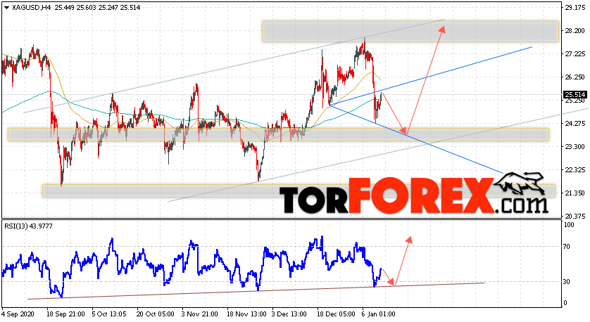 Таким образом, Серебро прогноз и аналитика XAG/USD на 13 января 2021 предполагает попытку теста области поддержки вблизи уровня 23.45. Далее, продолжение роста котировок с целью выше уровня 28.35. Отменой варианта подъёма цен на Серебра выступит падение и пробой уровня 22.15. Это укажет на пробой уровня поддержки. В этом случае стоит ожидать продолжения снижения цены ниже уровня 20.05.