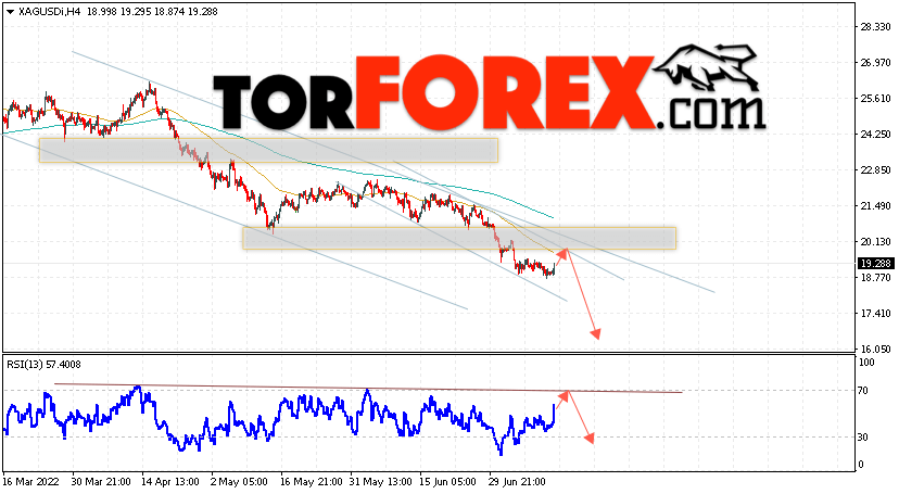 Дополнительным сигналом в пользу падения котировок и цен на Серебро XAG/USD выступит тест линии сопротивления на индикаторе относительной силы (RSI). Вторым сигналом в пользу падения станет отскок от верхней границы медвежьего канала. Отменой варианта падения цен на Серебро 14 июля 2022 станет сильный рост и пробой 20.55. Это укажет на пробой области сопротивления и продолжение роста в область выше уровня 21.95. Ожидать ускорения падения котировок XAG/USD стоит с пробоем области поддержки и закрытием цены под уровнем 18.55.