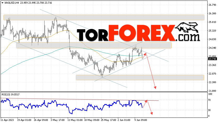 Дополнительным сигналом в пользу снижения котировок и цен на Серебро XAG/USD выступит тест линии сопротивления на индикаторе относительной силы (RSI). Вторым сигналом в пользу падения станет отскок от верхней границы медвежьего канала. Отменой варианта снижения цен на Серебро 14 июня 2023 станет сильный рост и пробой 24.45. Это укажет на пробой области сопротивления и продолжение роста в область выше уровня 26.85. Ожидать ускорения падения котировок XAG/USD стоит с пробоем области поддержки и закрытием цены под уровнем 23.25, что укажет на пробой нижней границы бычьего канала коррекции.