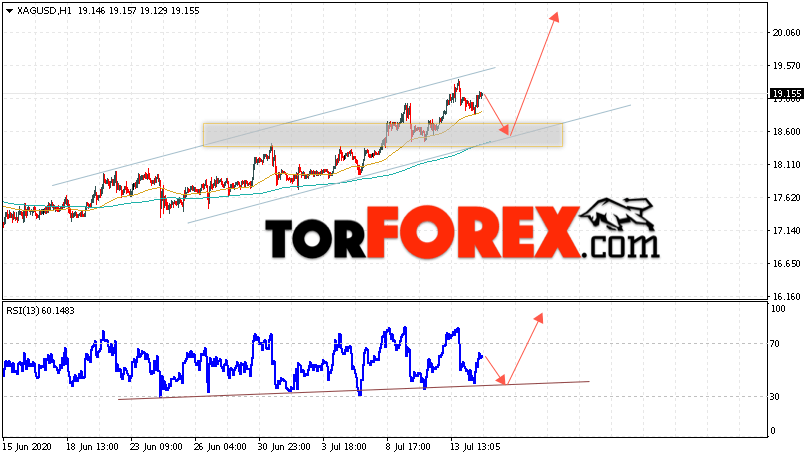 Дополнительным сигналом в пользу подъёма котировок и цен на Серебро XAG/USD выступит тест линии поддержки на индикаторе относительной силы. Вторым сигналом в пользу роста станет отскок от нижней границы восходящего канала. Отменой варианта роста цен на Серебро 15 июля 2020 станет падение и пробой 18.05. Это укажет на пробой области поддержки и продолжение падения в область ниже уровня 17.15. Ожидать ускорения роста котировок XAG/USD стоит с пробоем области сопротивления и закрытием цен над уровнем 19.60.