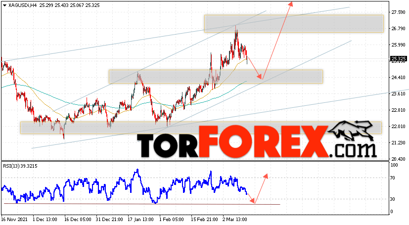 Дополнительным сигналом в пользу роста котировок и цен на Серебро XAG/USD выступит тест линии поддержки на индикаторе относительной силы (RSI). Вторым сигналом в пользу роста станет отскок от нижней границы бычьего канала. Отменой варианта роста цен на Серебро 15 марта 2022 станет падение и пробой 24.05. Это укажет на пробой области поддержки и продолжение падения в область ниже уровня 22.15. Ожидать ускорения роста котировок XAG/USD стоит с пробоем области сопротивления и закрытием цены над уровнем 26.55.