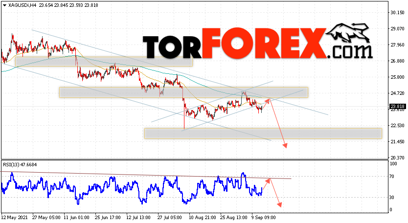 Дополнительным сигналом в пользу падения котировок и цен на Серебро XAG/USD выступит тест линии тренда на индикаторе относительной силы (RSI). Вторым сигналом в пользу снижения станет отскок от нижней границы пробитого канала. Отменой варианта падения цен на Серебро 15 сентября 2021 станет сильный рост и пробой 25.05. Это укажет на пробой области сопротивления и продолжение подъёма в область выше уровня 26.55. Ожидать ускорения падения котировок XAG/USD стоит с пробоем области поддержки и закрытием цены под уровнем 23.05.