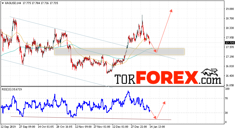 Дополнительным сигналом в пользу роста котировок и цен на Серебро XAG/USD выступит тест линии тренда на индикаторе относительной силы. Вторым сигналом в пользу подъёма станет отскок от верхней границы нисходящего канала. Отменой варианта роста цен на Серебро 15 января 2020 станет падение и пробой 17.05. Это укажет на пробой области поддержки и продолжение падения в область ниже уровня 16.65. Ожидать ускорения роста котировок XAG/USD стоит с пробоем области сопротивления и закрытием над уровнем 18.35.