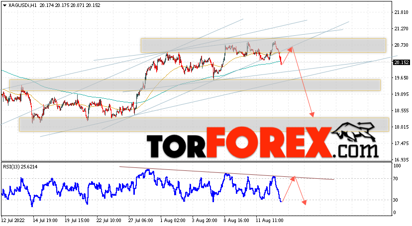 Дополнительным сигналом в пользу падения котировок и цен на Серебро XAG/USD выступит тест линии сопротивления на индикаторе относительной силы (RSI). Вторым сигналом в пользу падения станет отскок от нижней границы бычьего канала. Отменой варианта падения цен на Серебро 16 августа 2022 станет сильный рост и пробой 21.45. Это укажет на пробой области сопротивления и продолжение роста в область выше уровня 22.65. Ожидать ускорения падения котировок XAG/USD стоит с пробоем области поддержки и закрытием цены под уровнем 19.05, что укажет на пробой нижней границы бычьего канала коррекции.